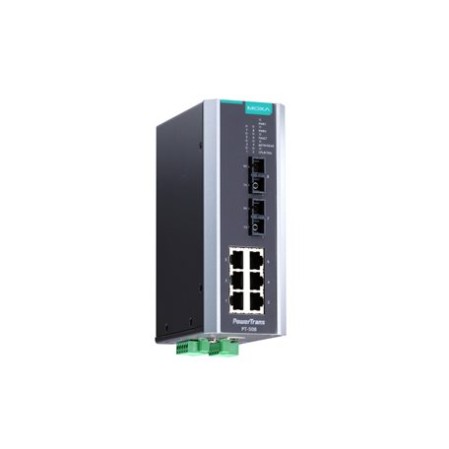 Switch Ethernet de rail DIN administrado IEC 61850-3, con 6 puertos 10 / 100BaseT (X) y 2 puertos multimodo 100BaseFX con conectores SC, 1 fuente de alimentación aislada (24 V CC), temperatura de funcionamiento de -40 a 85 ° C.